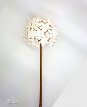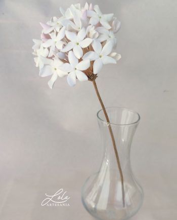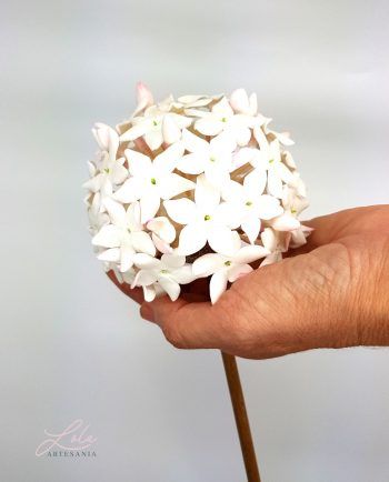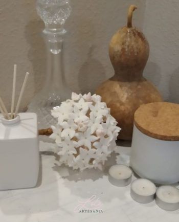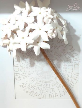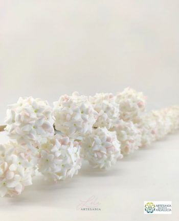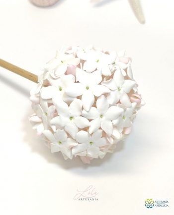 Adorno Biznaga Malagueña es una tradición en Málaga, como tradición es también encontrar en nuestra preciosa calle Larios a los típicos biznagueros (vendedores ambulantes) con sus pencas repletas de biznagas, confeccionadas con jazmines naturales insertados uno a uno en un tallo seco de nardos silvestres. Es una composición de jazmines cerrados que al atardecer comienzan a abrir e inundan el centro de Málaga con su característico olor. Es tal la importancia de la biznaga en nuestra ciudad que se ha convertido en el símbolo protagonista del festival de cine español. La pasión que despierta la biznaga ha hecho que se convierta en un indispensable recuerdo de nuestra ciudad por lo que los artesanos la reproducimos en porcelana fría elaborando jazmín a jazmín con mucha dedicación y cariño para luego montarlos formando una delicada biznaga. Al estar hecha a mano cada jazmín es distinto cada biznaga es diferente y cada artesano hace suya la biznaga que realiza. Si pasas por Málaga no dejes de adquirir una preciosa y delicada biznaga símbolo de nuestra ciudad