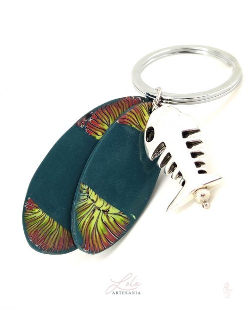 Los Llaveros De Surf. Así llamo a este modelo de llavero, Me recuerda a las bonitas tablas de surf decoradas. Por eso su decoración es una raspa de pez.