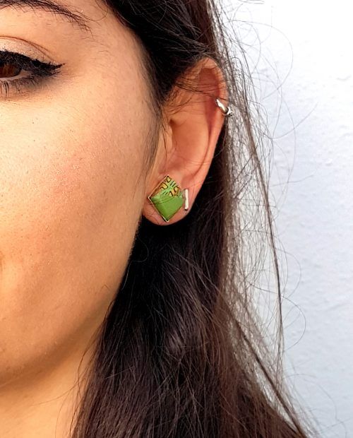Espectacular el tono verde de estos pendientes. Para las amantes de etas tonalidades hemos diseñado este estampado «LABERINTO» y lo hemos combinado con un tono liso. Ponte tu look más dinámico y actual y a ¡¡disfrutar del día!!!