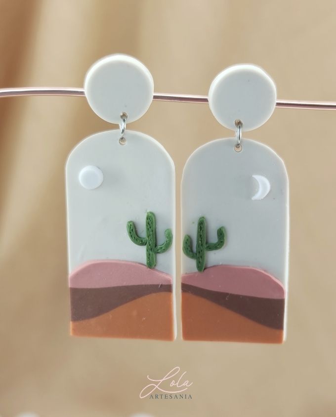 Pendientes Desierto hechos a mano en arcilla polimérica. Esta colección está inspirada en la cultura Azteca. Inspirados en los paisajes desérticos, la noche y el día en la inmensidad de las dunas con sus cactus solitarios los bellos paisajes y sus tonalidades terrosas. Hemos elaborado estos complementos en dos tonalidades. Tonalidad clara (beige) y sobre una tonalidad oscura (negros).